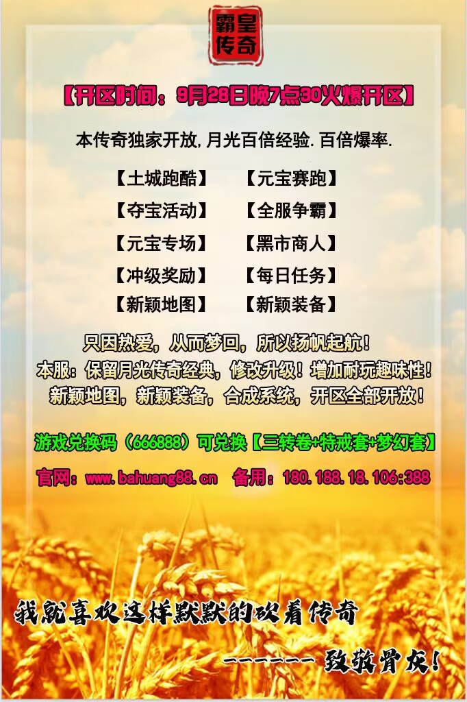 本服:保留月光传奇经典,修改升级!增加耐玩趣味性!等级好生,装备好打,百倍爆率,请大家耐心游戏!